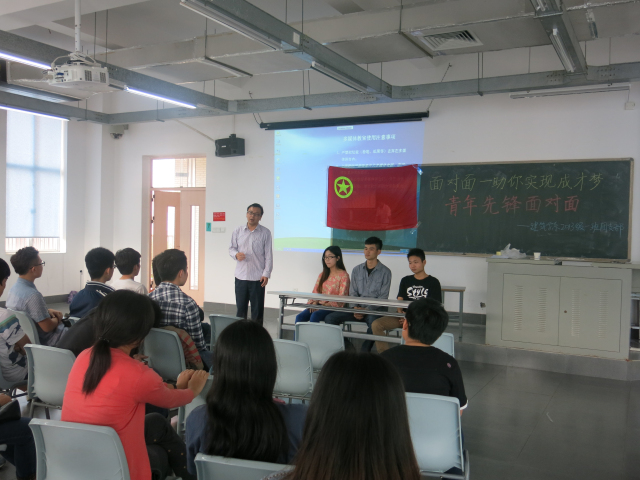 为进一步深化三项教育,促进学生成长成才,树立我系学子昂扬向上的价值追求,2014年3月27日星期四16:00,建筑学系团委举办了 “面对面—助你实现成才梦”之青年先锋面对面活动。此次活动邀请了2010级先进事迹的优秀学生代表林雨庄、谢尚儒、刘一锐三名学生,建筑学系学生工作办公室主任刘旭老师出席会议,2013级一班学生参加了本次活动。