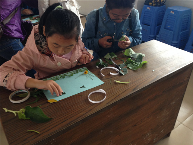2014年11月8日,小朋友和志愿者两人一组共同完成作品,完成了一幅幅“叶子的图画”。