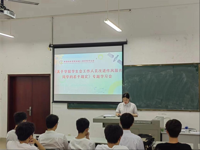 为了更好的促进学生会工作,进一步实现学生会内部管理规范化、制度化,完善学生会内部管理制度。从而能够调动各部位工作积极性和主动性,实现学生会工作的协调统一:全面了解、掌握学生会工作人员的综合素质,帮助学生会工作人员正确的认识自己,发扬优点,弥补不足,提高工作效率,确保各项工作顺利的开展,机械工程学院学生会于2024年3月14日在机电楼203教室开展学生会《关于学联学生会工作人员改进作风服务同学的若干规定》专题学习会。